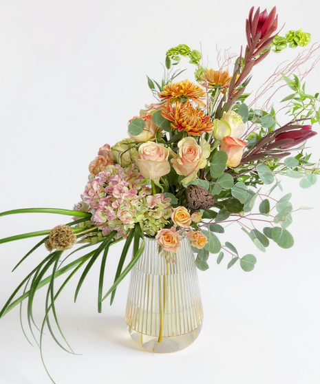 Elevate your fall décor with Autumn Ascent, a modern arrangement that captures the rich textures and warm tones of the season. Golden mums, soft peach roses, and antique hydrangea mingle with dramatic burgundy accents, sculptural greenery, and airy seasonal foliage. Designed in a sleek, ribbed glass vase, its tall, asymmetrical style makes a bold statement — perfect for an entryway, dining table, or sending as a sophisticated seasonal gift.