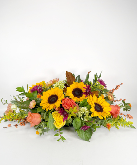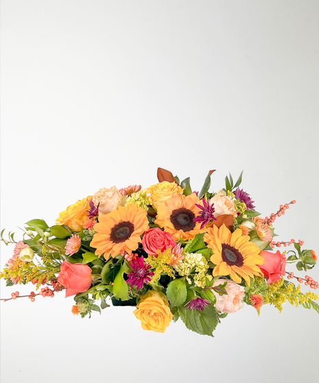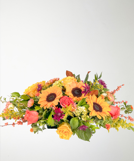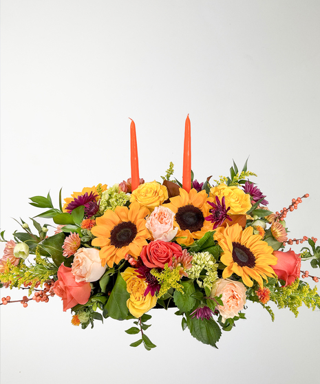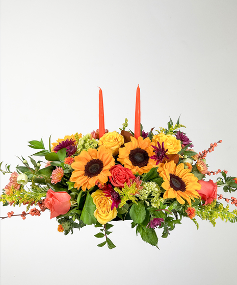 Our Alabama Thanksgiving Centerpiece will bring warmth and beauty to any holiday table or Thanksgiving celebration. This fresh centerpiece features bright sunflowers, button spray mums, orange roses, hypericum berry, solidago, pinecones, and other premium foliage gathered around two elegant tapered candles. Fresh flowers are the perfect complement to your Thanksgiving tablescape.