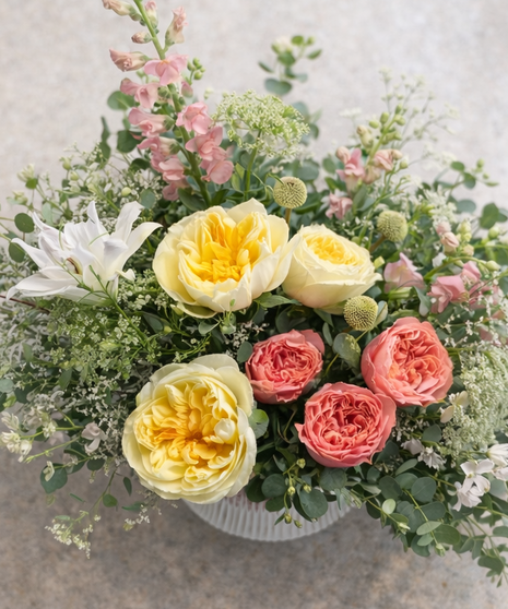 Soft, radiant, and effortlessly elegant, Buttercream Bliss is a celebration of spring in its most delicate form. Creamy yellow roses and blush-toned blooms are artfully arranged with airy accents and fresh greenery, creating a design that feels both light and luxurious.
