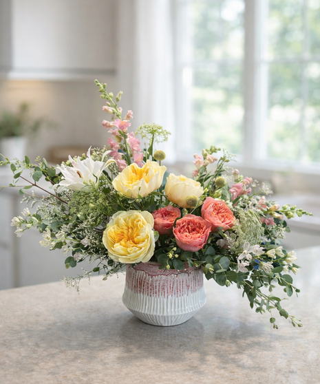 With its gentle color palette and graceful movement, this arrangement brings warmth, beauty, and a sense of calm to any space. Designed in a textured ceramic vase, Buttercream Bliss is perfect for Easter, birthdays, or simply sending a little sunshine to someone you love.