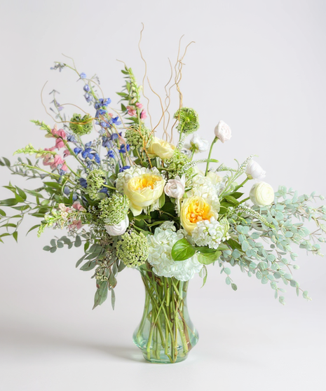 Soft, romantic, and full of sunshine — Honey Blossoms captures the feeling of love in bloom. This graceful garden-style arrangement blends buttery yellow roses, delicate ranunculus, pastel delphinium, and lush hydrangea with airy greenery for a look that’s as sweet as honey. Designed in a timeless glass vase, its gentle movement and natural texture evoke the warmth of a golden afternoon and the tenderness of heartfelt affection.