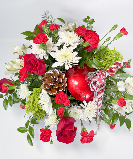 Celebrate the season with the festive charm of Jingle Bell Blooms! Featuring vibrant red roses, cheerful white mums, and sprigs of greenery accented with pinecones, candy cane ribbon, and silver baubles, all arranged in a glittering, keepsake ornament vase. Perfect for spreading holiday joy!