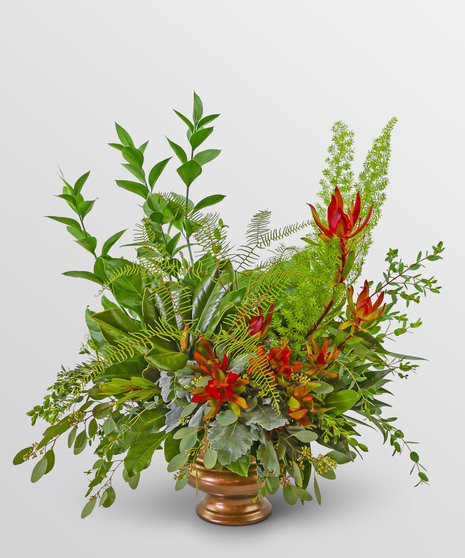 The Verdant Farewell Collection is crafted with an array of rich green foliage, such as elegant ferns, palm leaves, eucalyptus, and ivy, creating a soothing and timeless display. Whether presented as a standing spray, wreath, casket spray, or bouquet, this collection offers a modern yet classic tribute that conveys respect and remembrance.